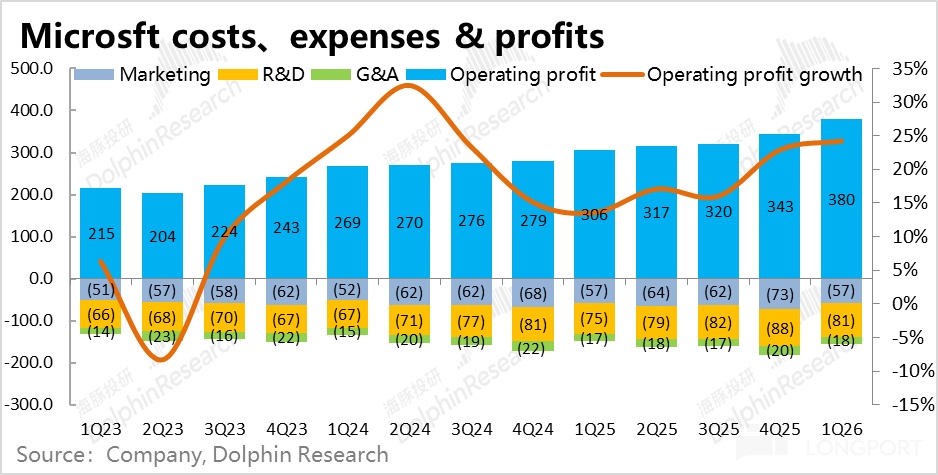 相比不错但不算特别惊喜的营收表现,本季微软在成本费用和盈利表现则更加优异,市场预期因Capex和折旧增涨导致毛利率收窄的情况并没那么严重,而出色的费用优化则让经营利润最终不降反增。
