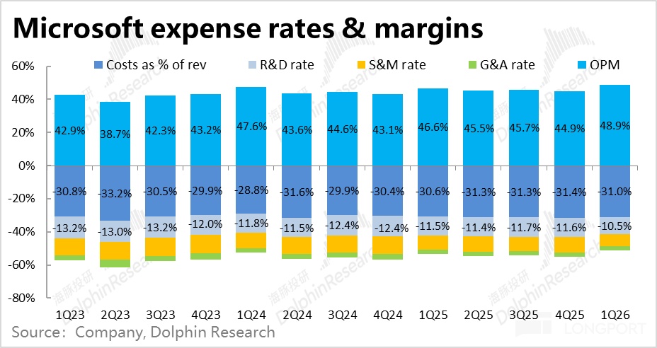 本季微软的毛利率为69%,虽然确实同比下降了0.4pct,但比彭博预期高出了整整1.5pct。同时,经营三费合计同比增长仅4.9%,相比上季的5.8%继续收窄,也远低于营收和毛利润约18%的增速,从而费用率占收入比重同比来看被摊薄了整整2pct。