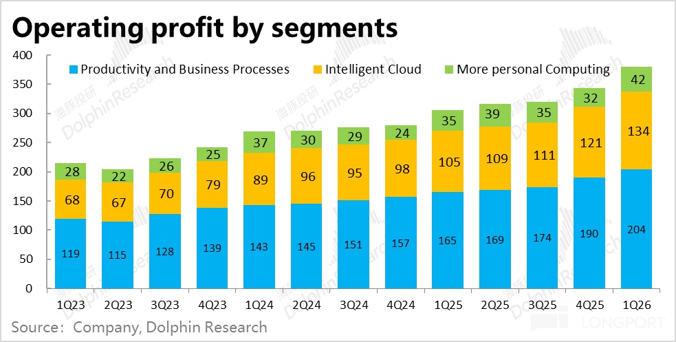 利润表现则更出色,提效和控费对冲了折旧导致的毛利率下滑,本季度微软整体经营利润率整整同比走高了2.3pct。最终经营利润$380亿,同比增长了24%,大幅跑赢营收增速。