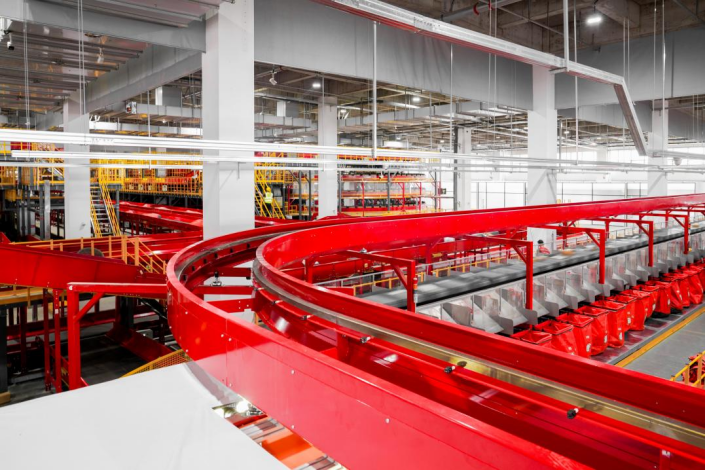 产业园内大规模部署了包括NC交叉带在内的各类自动化设备,自动化覆盖率约90%。近40公里的自动化流水线与近400条伸缩机协同作业,快件分拣准确率高达99.98%。通过物联网、AI视觉识别与大数据算法的深度协同,系统实现全链路智能监控与动态调度,确保产业园实现99.5%以上的持续运转率。