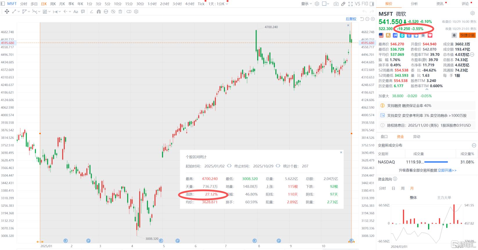 今年迄今,微软股价累计上涨了约27%,现总市值4.03万亿美元。