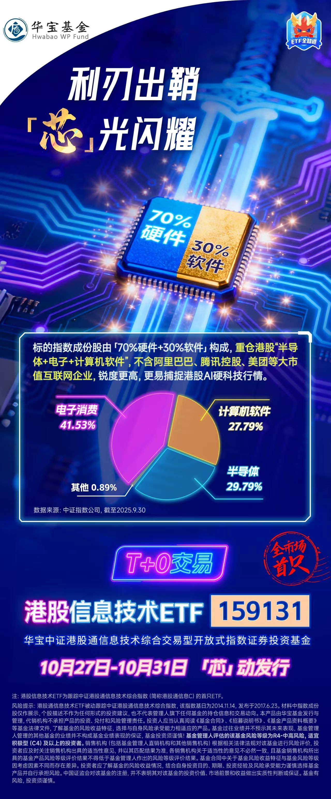 千亿规模ETF大厂——华宝基金10.27-10.31火线启动全市场首只港股信息技术ETF(159131)全网发售,该基金为全市场首只跟踪中证港股通信息技术综合指数(简称“港股通信息C”)的ETF,其标的指数由属于信息技术产业的41只港股硬科技公司构成成份股组合,将为投资者参与把握港股“中国硬科技资产”投资机遇提供首选创新ETF工具。