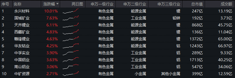 细分方向来看,锂业龙头显著领涨,永兴材料涨停,天齐锂业涨逾6%,西藏矿业、赣锋锂业涨超4%。权重股方面,北方稀土涨超4%,洛阳钼业、紫金矿业涨逾1%。