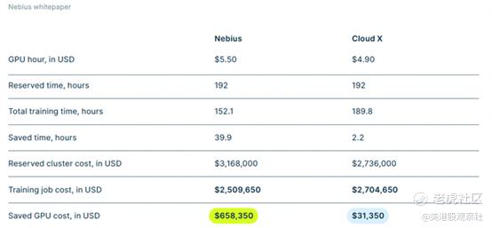 本季度最重要的事件之一,是Nebius发布了题为《AI集群的经济学》(The Economics of AI Clusters)的白皮书。该白皮书显示,相较于常规GPU云服务,Nebius的基础设施在模型训练工作负载的执行效率上高出21%。这一优势的核心在于:在基准训练任务中,Nebius能维持GPU 100%的利用率,同时将平均故障间隔时间保持在33小时,并将故障恢复流程自动化至12分钟内。这使得每次模型训练周期可节省40万至65万美元成本,同时还能将集群的总体拥有成本降低20%。