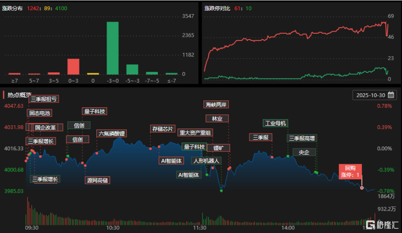10月30日,沪指午后失守4000点,全市场成交额2.46万亿元,超4100股下跌。能源金属、钢铁、量子科技、电池等板块涨幅居前,CPO、游戏、煤炭板块下跌。