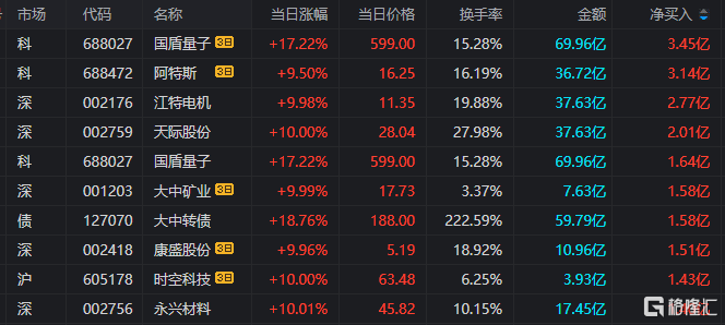 龙虎榜单日净买入额前三为江特电机、天际股份、国盾量子,分别为2.77亿元、2.01亿元、1.64亿元。