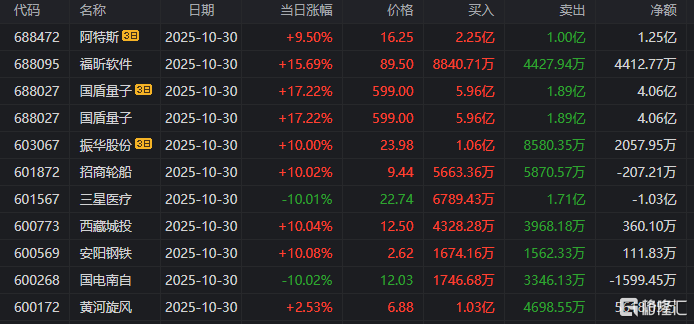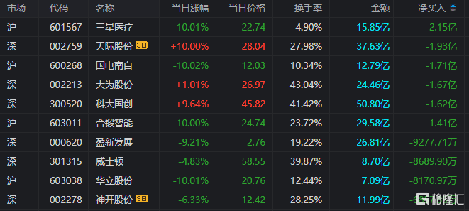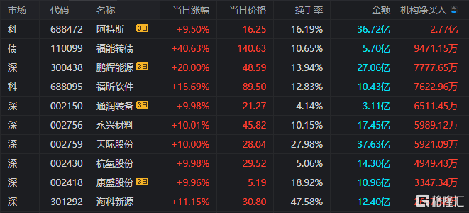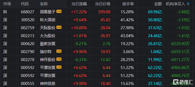 龙虎榜中涉及机构专用席位的个股中,当日净卖出额前三为科大国创、大为股份、盈新发展,分别为3.59亿元、1.41亿元、8229.90万元。