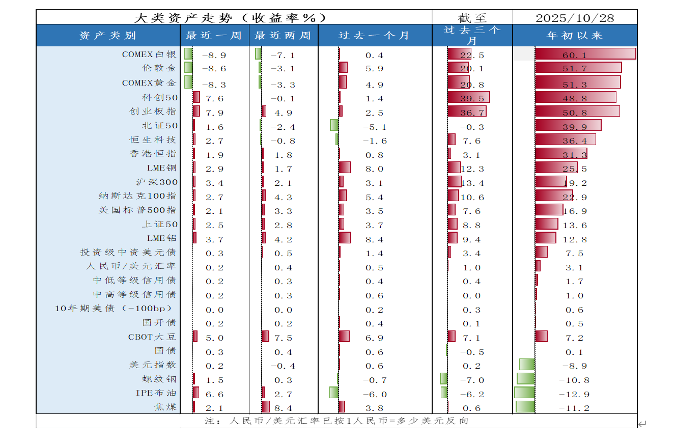 从周度数据看,科技成长与黄金此消彼长。上周创业板、科创50涨幅接近8%,伦敦金和白银跌幅接近9%,基本是旗鼓相当。回首2025年这十个月,投资者发现最有效的策略仍然是哑铃策略。只不过在过去三年安心三宝(黄金+长债+红利低波)Vs科技成长的长跑中,长债和红利低波掉队了而已。即使没掉队的黄金和AI,逻辑也发生了变化。以前是“落霞与孤鹜齐飞,秋水共长天一色”,是比翼齐飞,目前却是此消彼长。
