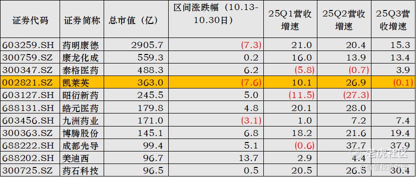 从股价走势来看,业绩暴雷已经昭告天下。10月13日至今,凯莱英股价下跌7.6%,同期,康龙化成、博腾股份、昭衍新药等都是上涨的。如果不是药明康德大股东昨晚宣布减持,今日大跌8.5%,CXO前14大公司中,就只有凯莱英和九洲药业是下跌的,而且,凯莱英的跌幅是最大的: