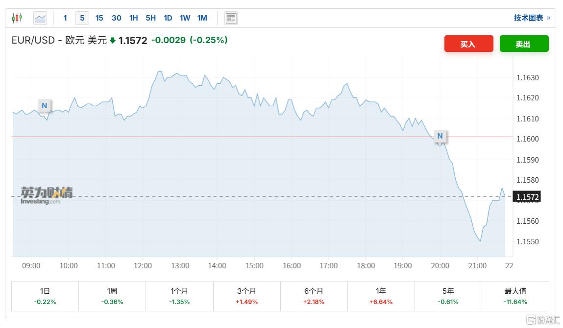 消息公布后,欧元兑美元维持跌势,现下跌0.23%至1.1572。