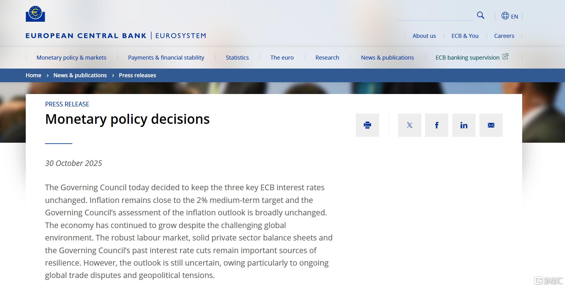 10月30日,欧洲央行将存款机制利率维持在2%不变,符合市场预期,连续第三次会议按兵不动。