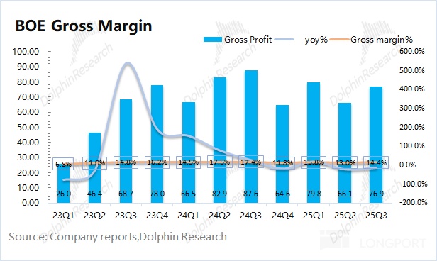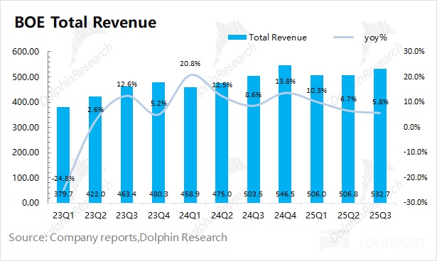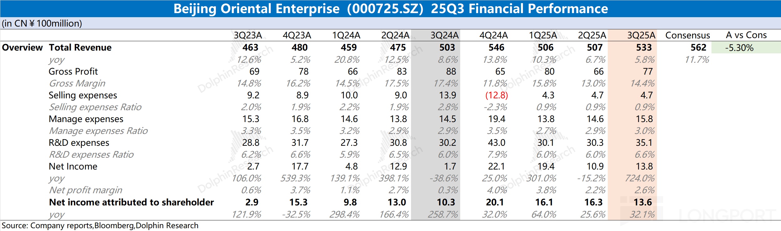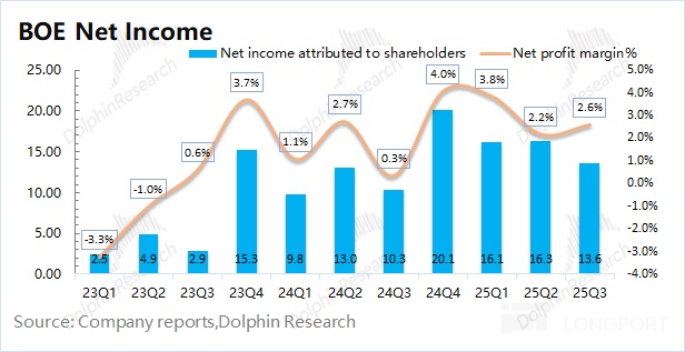 1.整体业绩:京东方 2025 年第三季度实现营收 533 亿元,同比增长 5.8%。此前公司收入的大幅回升,主要是受面板价格回暖的带动。由于下游需求仍相对偏弱,价格开始趋于平稳,公司单季度收入维持在 500 亿附近。京东方 2025 年第三季度归母净利润为 13.6 亿元,同比增长 32%,主要是受非经营性因素(营业外收入等方面)的影响。