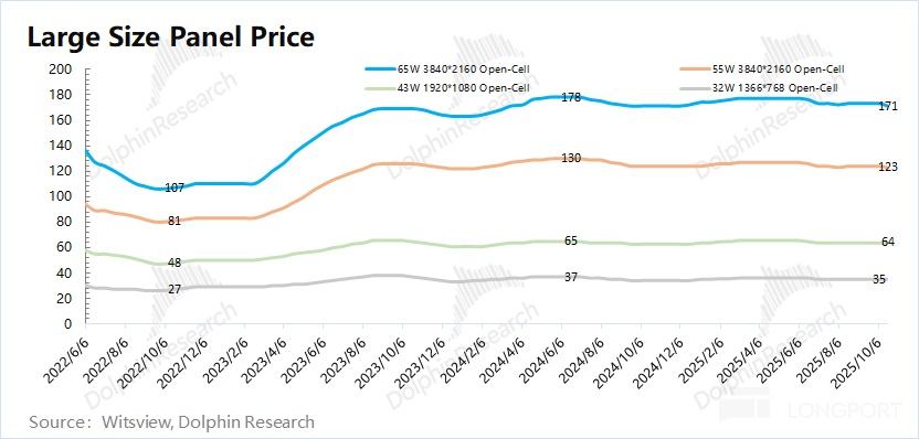 3.面板价格变化:公司的主要营收来自于电视屏幕等大面板,面板价格变动直接影响公司的业绩表现。三季度大面板价格保持相对平稳,其中 65 寸/55 寸/43 寸/32 寸面板价格分别维持在 173/124/64/35 美元。由于下游市场需求相对平淡,面板价格的上涨已经按下了 “暂停键”。
