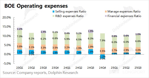 2.毛利率及费用率:$京东方A(000725.SZ) 本季度毛利率为 14.4%,同比明显下滑 3pct。其实这里,公司从去年年末开始进行了会计政策调整(公司将计提的保证类质保费用计入 “主营业务成本”,而不再计入 “销售费用”)。这项操作,让销售费用降低了,而营业成本则增加了。
