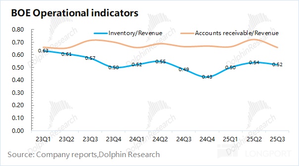 4.存货及价格变动:京东方在 2025 年第三季度的存货增加至 278.6 亿元,环比微增 1.9%。公司本季度存货/收入的比值维持在 0.52。当下供需情况相对平稳,未看到下游大幅拉货的迹象。