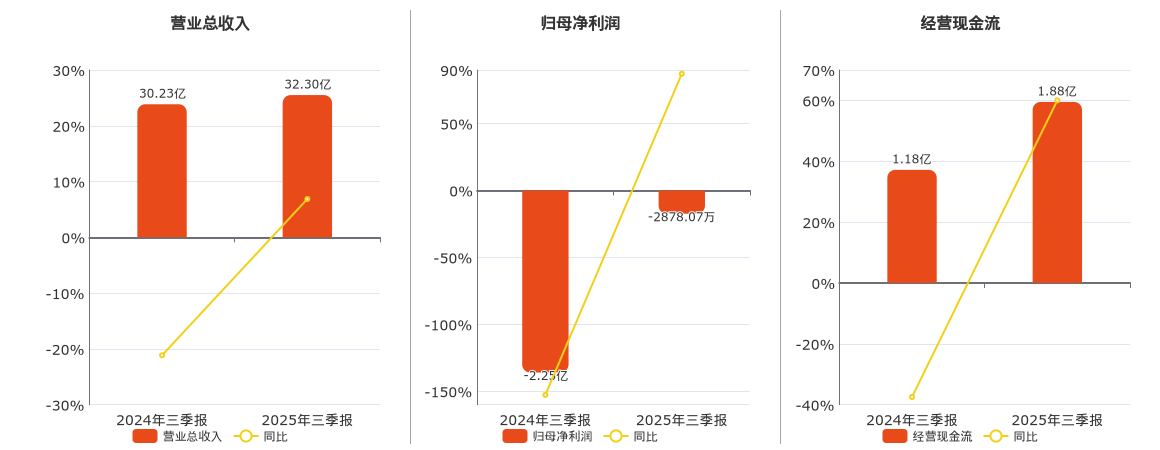 公司营业总收入为32.30亿元,在已披露的同业公司中排名第3,较去年同报告期营业总收入增加2.08亿元,同比较去年同期上涨6.87%。归母净利润为-2878.07万元,较去年同报告期归母净利润增加1.96亿元。经营活动现金净流入为1.88亿元,在已披露的同业公司中排名第4,较去年同报告期经营活动现金净流入增加7065.32万元,同比较去年同期上涨60.02%。