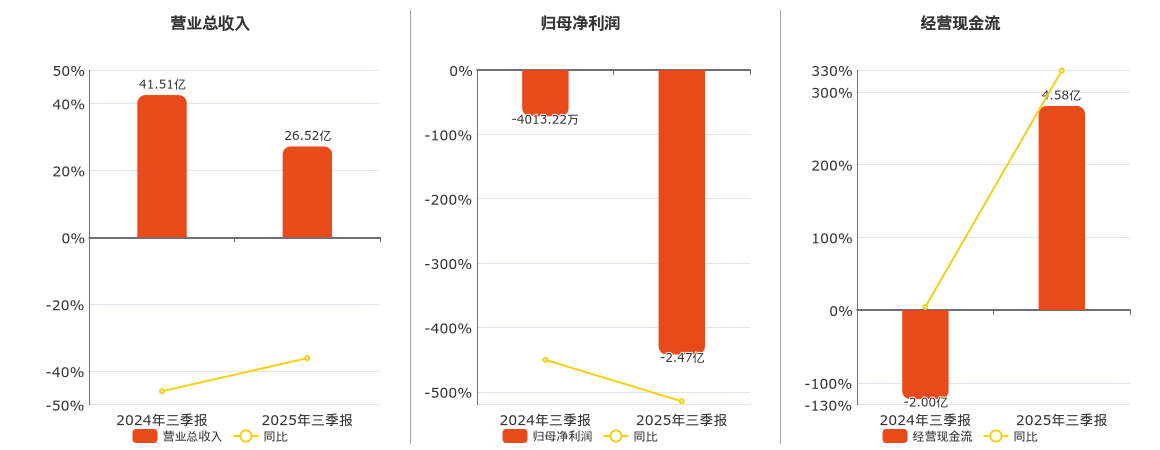 公司营业总收入为26.52亿元,在已披露的同业公司中排名第37,较去年同报告期营业总收入减少14.98亿元,同比较去年同期下降36.10%。归母净利润为-2.47亿元,在已披露的同业公司中排名第50,较去年同报告期归母净利润减少2.07亿元。经营活动现金净流入为4.58亿元,在已披露的同业公司中排名第17,较去年同报告期经营活动现金净流入增加6.58亿元,实现2年连续上涨。