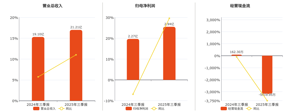 公司营业总收入为21.21亿元。归母净利润为2.94亿元。经营活动现金净流入为-5919.95万元,在已披露的同业公司中排名第210,较去年同报告期经营活动现金净流入减少6082.25万元,同比较去年同期下降3747.46%。