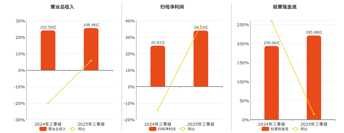 公司营业总收入为108.46亿元,在已披露的同业公司中排名第13,较去年同报告期营业总收入增加5.96亿元,同比较去年同期上涨5.82%。归母净利润为28.53亿元,在已披露的同业公司中排名第16,较去年同报告期归母净利润增加7.72亿元,同比较去年同期上涨37.12%。经营活动现金净流入为295.98亿元,在已披露的同业公司中排名第6,较去年同报告期经营活动现金净流入增加36.93亿元,实现2年连续上涨,同比较去年同期上涨14.25%。