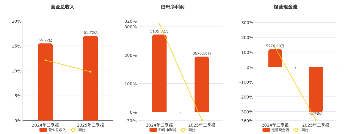 公司营业总收入为61.72亿元,在已披露的同业公司中排名第33,较去年同报告期营业总收入增加5.50亿元,实现2年连续上涨,同比较去年同期上涨9.79%。归母净利润为3670.16万元,在已披露的同业公司中排名第48,较去年同报告期归母净利润减少1465.65万元,同比较去年同期下降28.54%。经营活动现金净流入为-1.48亿元,在已披露的同业公司中排名第49,较去年同报告期经营活动现金净流入减少2.06亿元,同比较去年同期下降355.87%。