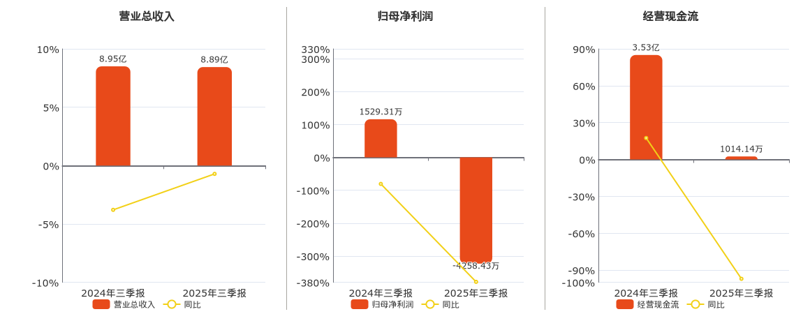 公司营业总收入为8.89亿元,在已披露的同业公司中排名第12,较去年同报告期营业总收入减少4999.37万元,同比较去年同期下降5.33%。归母净利润为-4258.43万元,在已披露的同业公司中排名第10,较去年同报告期归母净利润减少5590.34万元,同比较去年同期下降419.72%。经营活动现金净流入为1014.14万元,在已披露的同业公司中排名第11,较去年同报告期经营活动现金净流入减少3.48亿元,同比较去年同期下降97.17%。