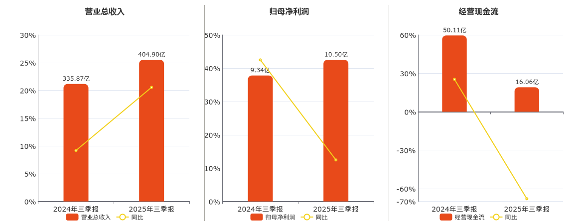 公司营业总收入为404.90亿元,在已披露的同业公司中排名第3,较去年同报告期营业总收入增加69.03亿元,实现3年连续上涨,同比较去年同期上涨20.55%。归母净利润为10.50亿元,在已披露的同业公司中排名第3,较去年同报告期归母净利润增加1.16亿元,实现3年连续上涨,同比较去年同期上涨12.45%。经营活动现金净流入为16.06亿元,在已披露的同业公司中排名第4。