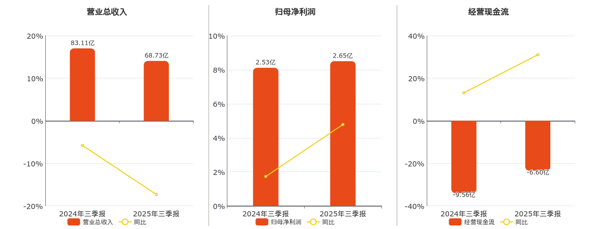 公司营业总收入为68.73亿元,较去年同报告期营业总收入减少14.38亿元,同比较去年同期下降17.30%。归母净利润为2.65亿元。经营活动现金净流入为-6.60亿元,在已披露的同业公司中排名第20。
