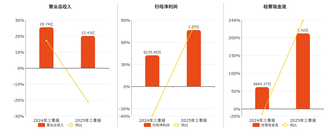 公司营业总收入为23.43亿元,较去年同报告期营业总收入减少6.32亿元,同比较去年同期下降21.24%。归母净利润为1.67亿元。经营活动现金净流入为3.42亿元。