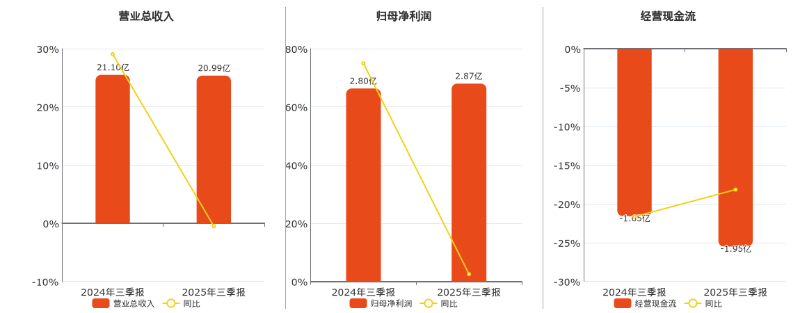 公司营业总收入为20.99亿元,在已披露的同业公司中排名第55。归母净利润为2.87亿元,在已披露的同业公司中排名第27,较去年同报告期归母净利润增加704.41万元,实现5年连续上涨,同比较去年同期上涨2.52%。经营活动现金净流入为-1.95亿元。