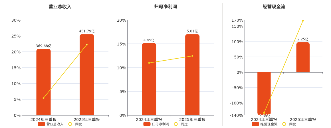公司营业总收入为451.79亿元,在已披露的同业公司中排名第1,较去年同报告期营业总收入增加82.12亿元,实现5年连续上涨,同比较去年同期上涨22.21%。归母净利润为5.01亿元,在已披露的同业公司中排名第8,较去年同报告期归母净利润增加5532.88万元,实现5年连续上涨,同比较去年同期上涨12.43%。经营活动现金净流入为2.25亿元,较去年同报告期经营活动现金净流入增加5.59亿元。