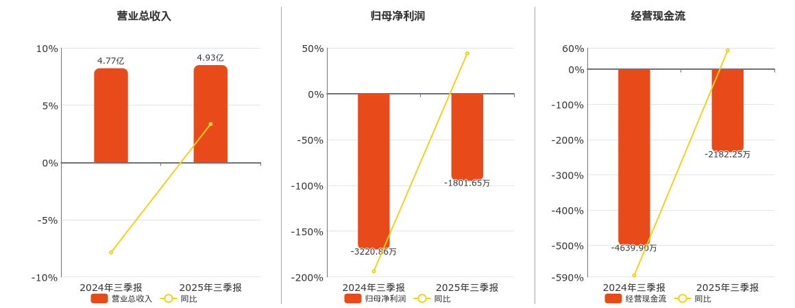 公司营业总收入为4.93亿元,较去年同报告期营业总收入增加1595.26万元,同比较去年同期上涨3.35%。归母净利润为-1801.65万元,较去年同报告期归母净利润增加1419.21万元。经营活动现金净流入为-2182.25万元,较去年同报告期经营活动现金净流入增加2457.65万元。