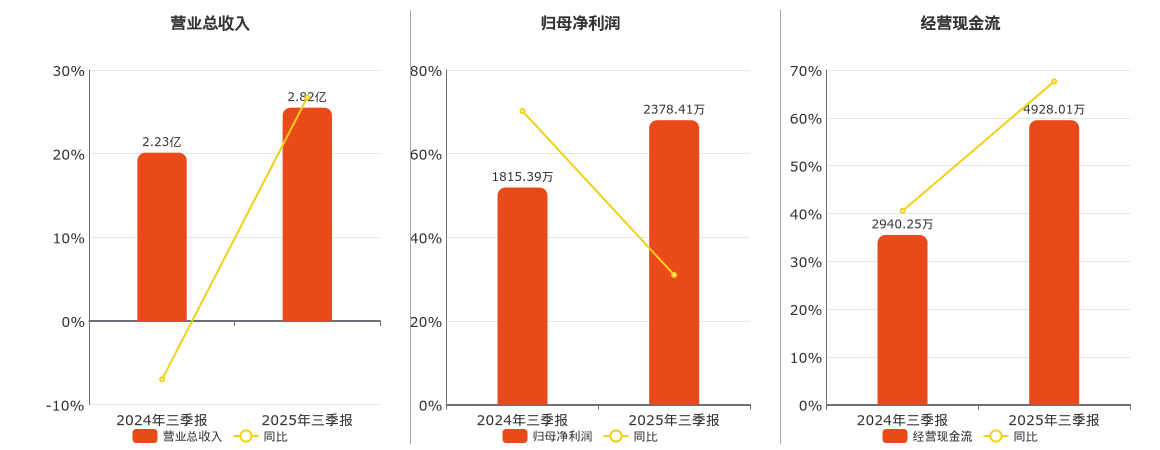 公司营业总收入为2.82亿元,在已披露的同业公司中排名第68。归母净利润为2378.41万元,在已披露的同业公司中排名第47。经营活动现金净流入为4928.01万元,在已披露的同业公司中排名第43。