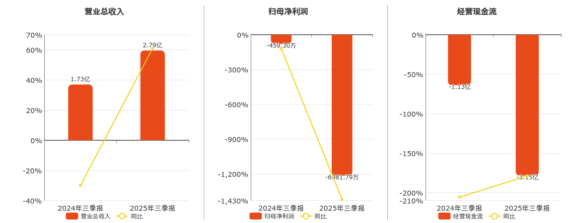 公司营业总收入为2.79亿元,在已披露的同业公司中排名第66,较去年同报告期营业总收入增加1.06亿元,同比较去年同期上涨61.01%。归母净利润为-6981.79万元,在已披露的同业公司中排名第77,较去年同报告期归母净利润减少6522.49万元。经营活动现金净流入为-3.15亿元,在已披露的同业公司中排名第83,较去年同报告期经营活动现金净流入减少2.02亿元。