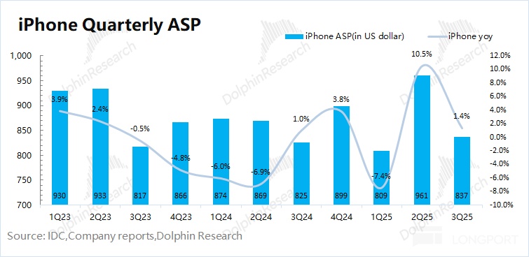 1)iPhone 出货量:根据 IDC 的数据,2025 年第三季度全球智能手机市场同比增长 2%。苹果本季度全球出货量同比增长 4.6% 左右,公司的出货量表现略好于整体市场。