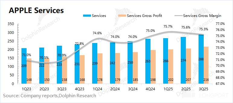 4、软件服务:公司软件服务本季度收入依然有 288 亿美元,好于市场一致预期(282 亿美元)。凭借 75.3% 的高毛利率,公司软件业务以 28% 的收入占比,产生了公司 45% 的毛利润。