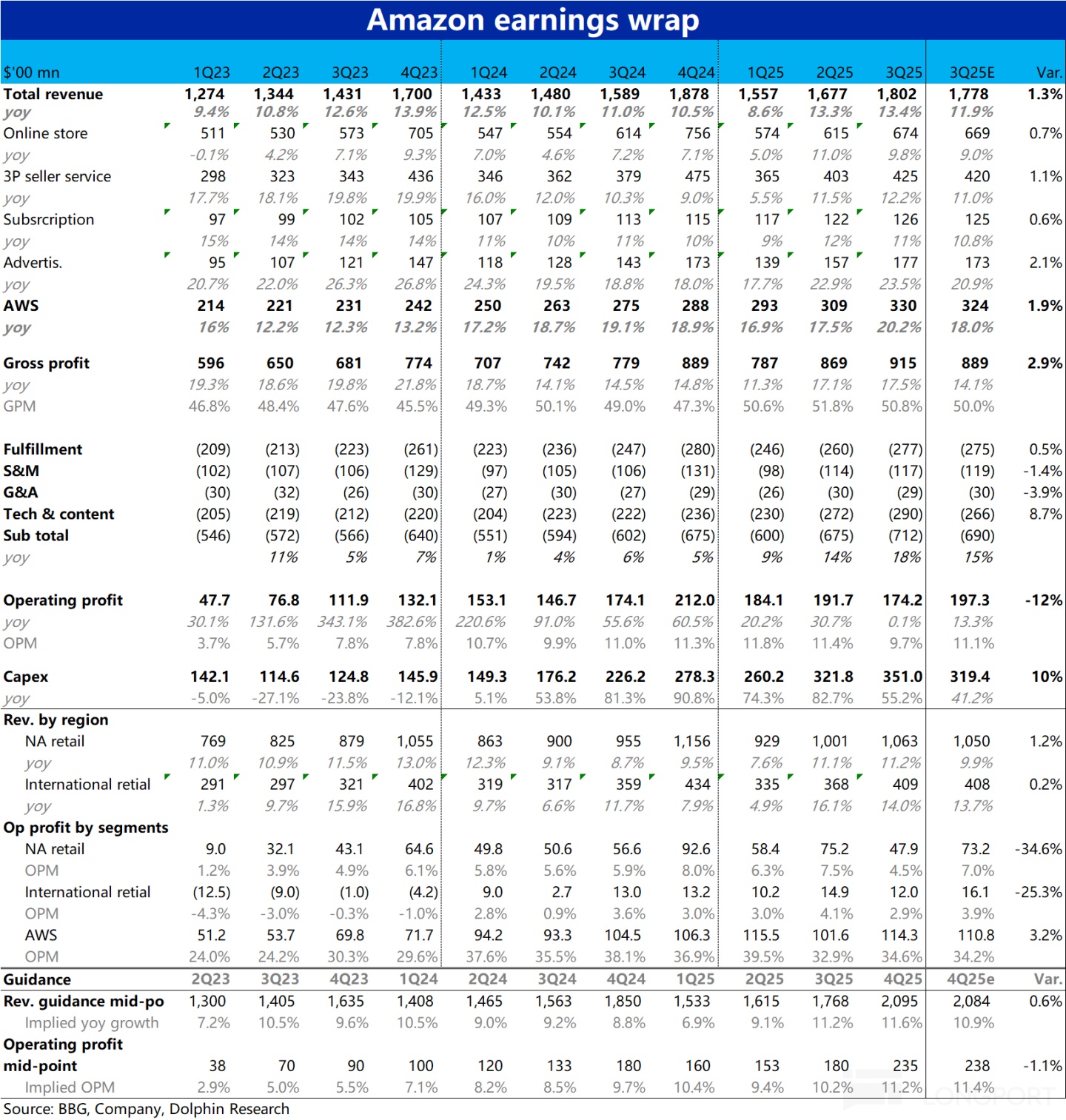 $亚马逊(AMZN.US) 于北京时间 10 月 31 日早美股盘后,公布了 2025 年的 3 季度财报。由于当前市场近乎所有目光都集中于云业务上,而本季 AWS 终于迎来了久等的超预期加速增长,是本季业绩最大的亮点和关键信号。抛开此项,公司在零售业务的增长与利润表现上则大体属于符合预期的平稳表现,具体来看: