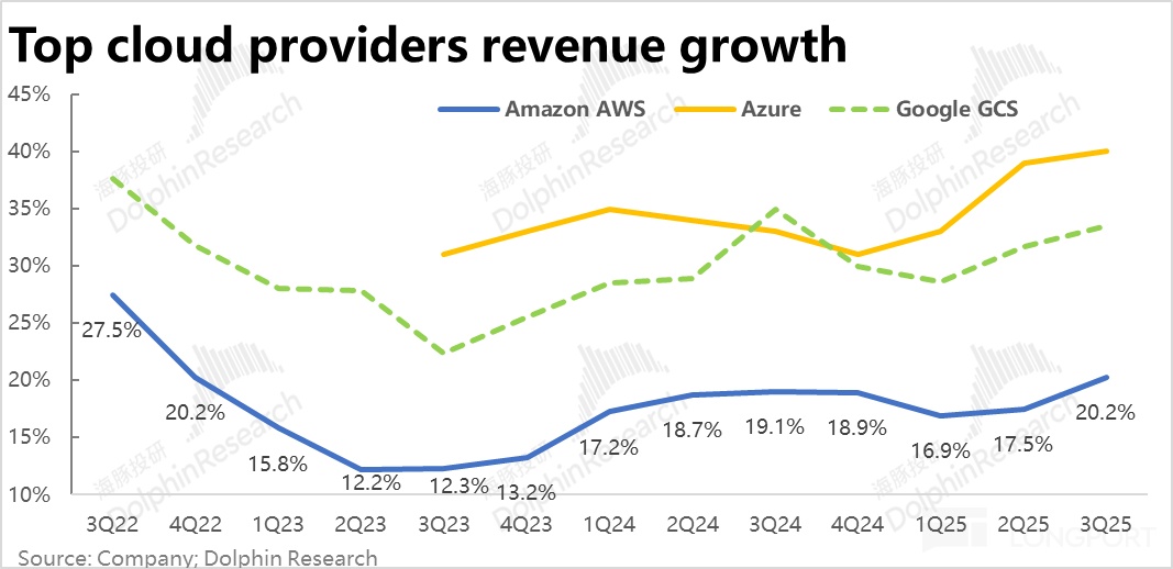 横向对比另两大云服务提供商,原先在 Azure 和 GCP 两个竞争对手的增长近 3~4 个季度以来增长持续提速的情况下,AWS 的增长迟迟却止步不前,可谓是近期亚马逊的股价表现显著跑输其他所有 Mag7 公司的最核心原因。而本季在两个竞争对手增速上升斜率有所放缓的同时,AWS 呈现出的加速迹象,预示着 AWS 无论是报表上的增速,还是在业务层面(尤其是 AI 相关)上差距正在收缩。