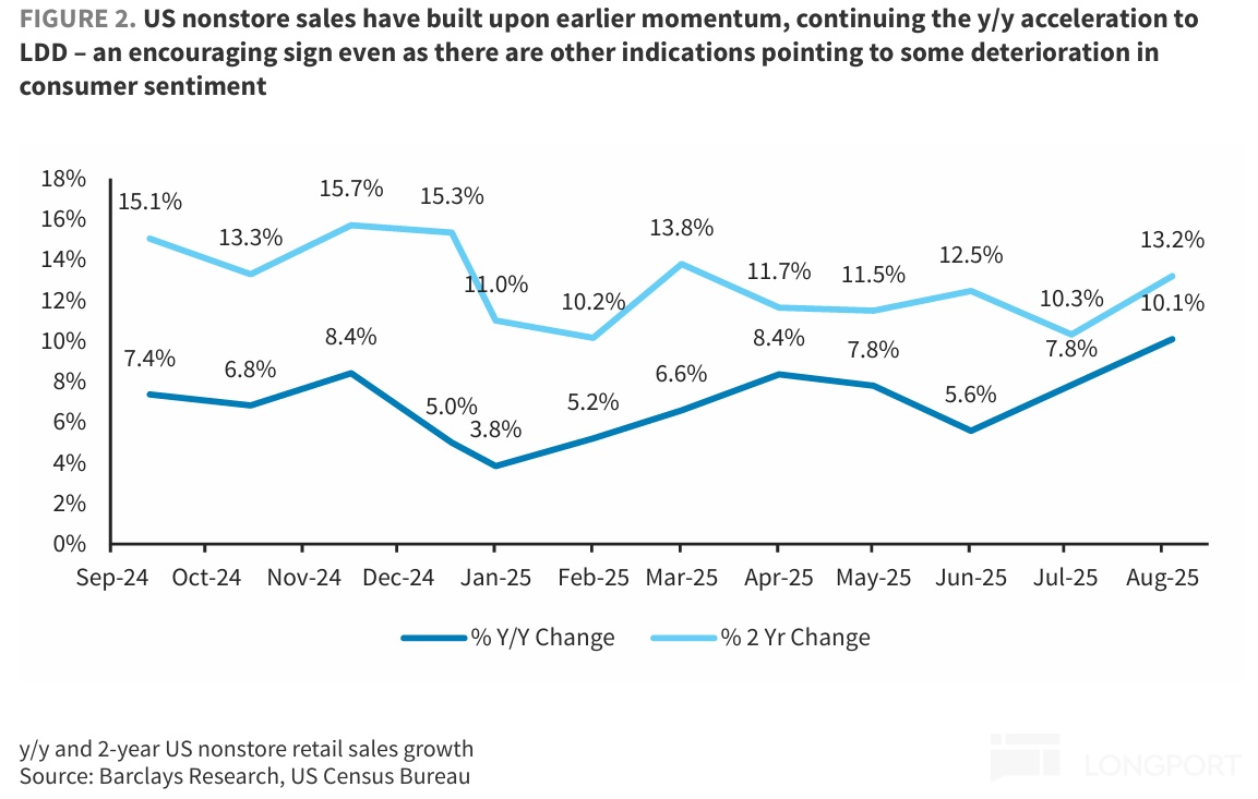 根据美国统计局,6 月以来可见美国无门店销售增长在持续改善,可见目前北美的线上消费还是坚韧的,和亚马逊的数据趋势一致。