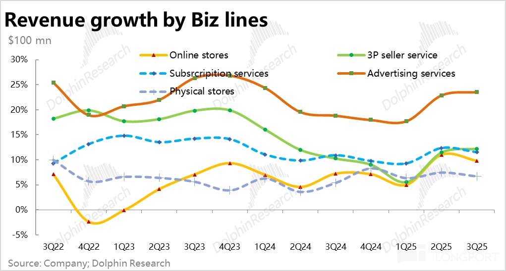 按细分业务线看,各业务线的增长也都相对平稳,无论是略有提速或减速,环比变化最多 1pct 左右。更具体来看:
