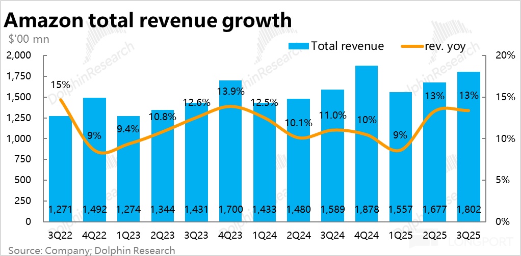合计所有业务,在 AWS 超预期提升增长,以及电商板块也稳健增长的带动下,亚马逊本季整体收入 1802 亿,同比增长 13.4%,环比略微提速 0.1pct,也跑赢市场预期的 1778 亿。