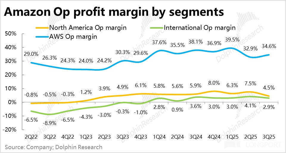 分板块看,前文已提到了 AWS 的利润率虽然再走低,但是大体符合预期的。而零售板块内北美地区的经营利润再加回 25 亿法律费用支出(不加回裁员费用计提)后约为 73 亿,与市场预期大体一致,对应经营利润率为 6.9%,同比仍是提升 1pct的。属于符合预期还不错的表现。
