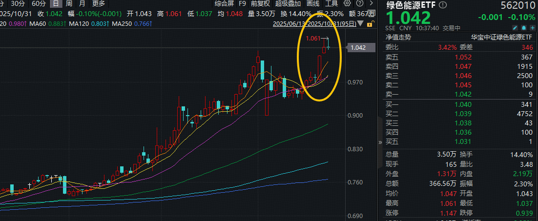 今日(10月31日)超123亿主力资金涌入电力设备板块,板块吸金额高居31个申万一级行业首位!热门ETF方面,全市场唯一跟踪绿色能源指数的绿色能源ETF(562010)场内涨幅盘中涨逾1.4%,现跌0.38%,上探2023年2月以来的高点!