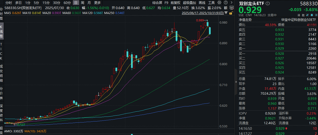 今日(10月30日)百分百布局战略新兴产业的硬科技宽基——双创龙头ETF(588330)随市回调,场内价格一度跌超3.8%,现跌3.53%,实时成交额超6900万元,交投火热,场内持续溢价,显示买盘资金强势!