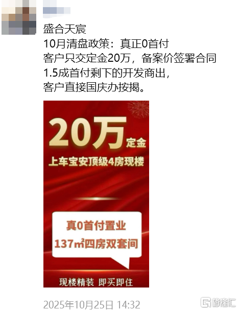 比如位于宝安航城的盛合天宸,朋友圈推广显示,“真正0首付,只交定金20万,备案价签合同,1.5成首付剩下的开发商出”。