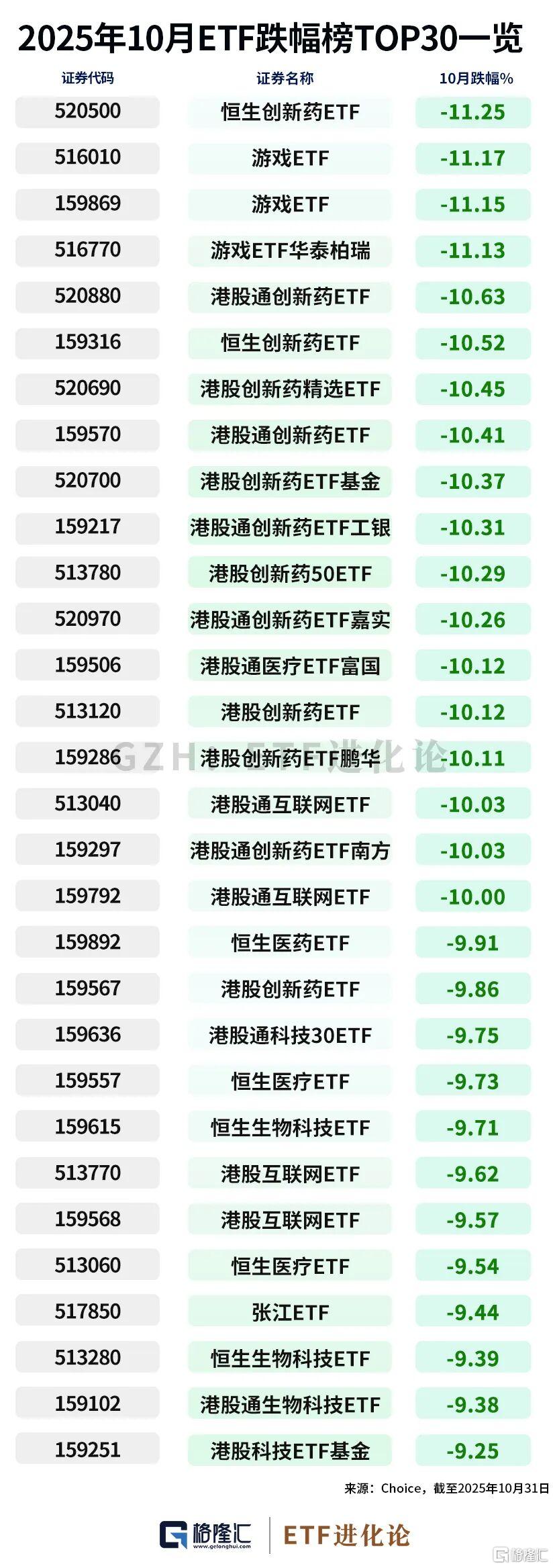 创新药、游戏板块表现较弱,恒生创新药ETF、游戏ETF在10月累计跌11%。