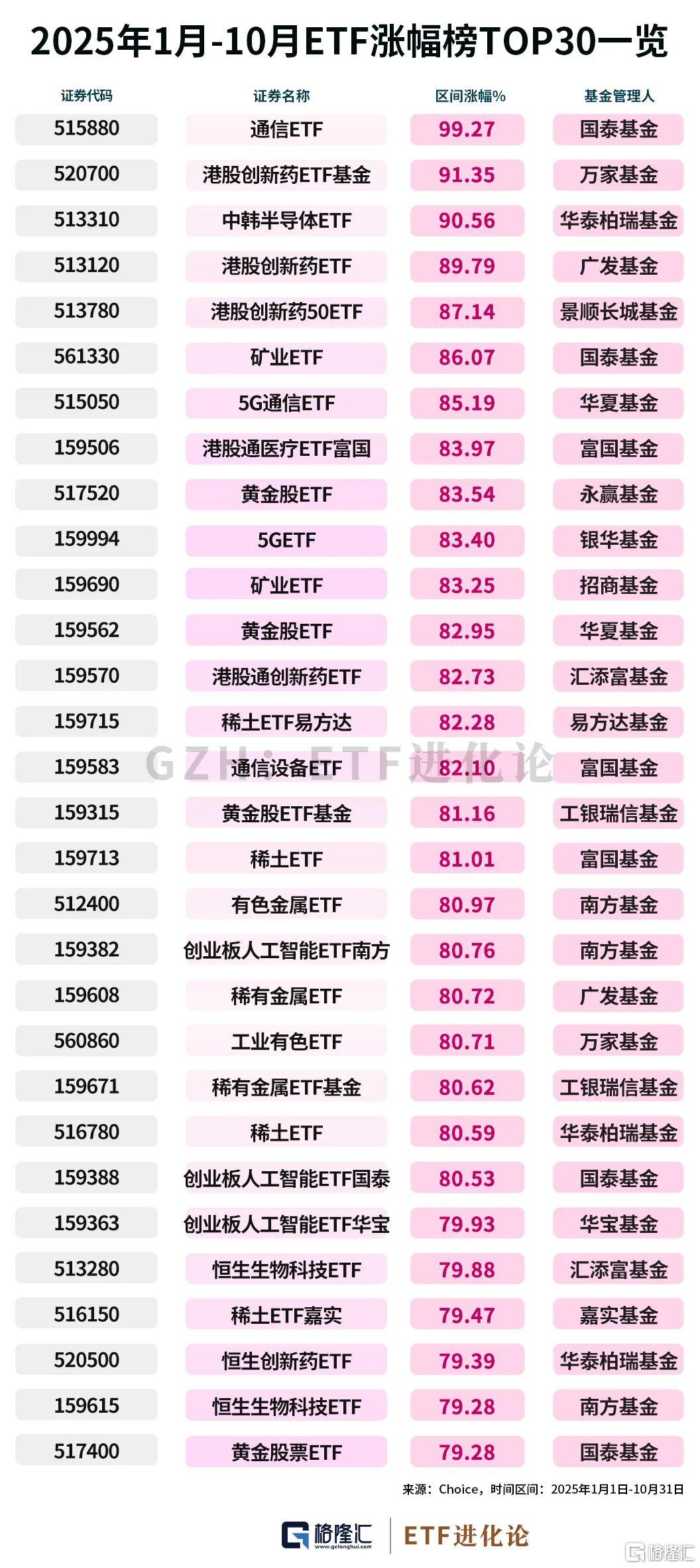 1月-10月,AI算力、创新药、黄金等主题ETF涨势凌厉,通信ETF、港股创新药ETF基金、中韩半导体ETF分别涨99.27%、91.35%、90.56%。
