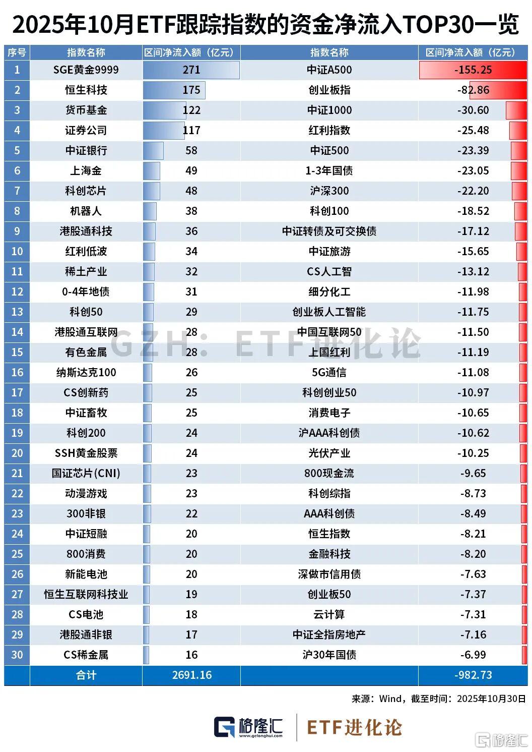 从全市场的指数角度来看,10月,跟踪SGE黄金9999、恒生科技、货币基金、证券公司指数的ETF“吸金”居前,分别净流入271亿元、175亿元、122亿元、117亿元。
