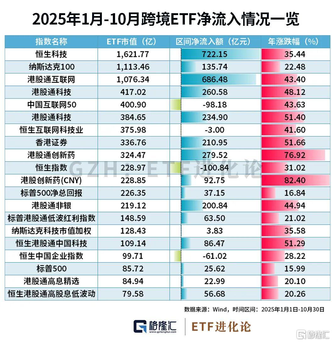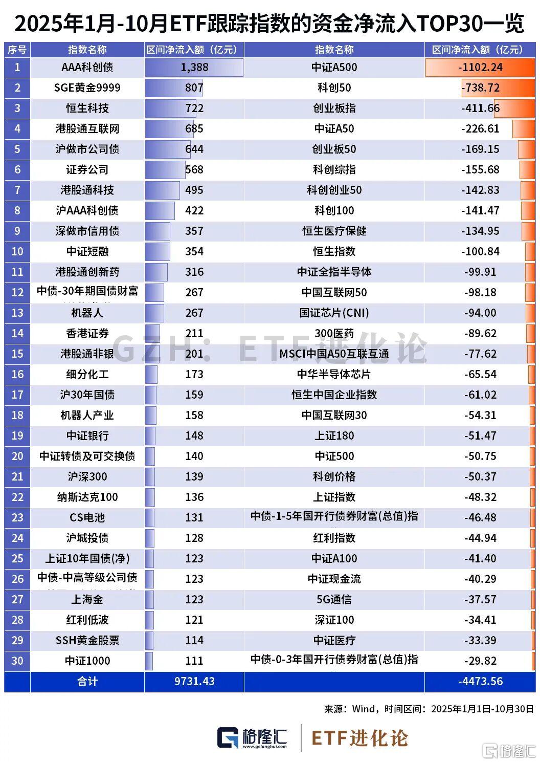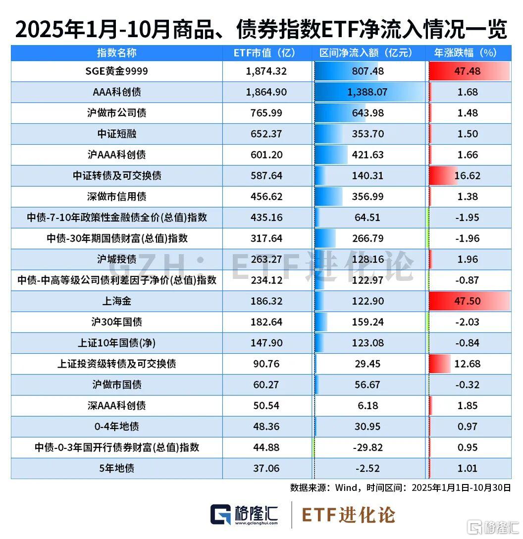 1月-10月,跟踪AAA科创债、SGE黄金9999、恒生科技、港股通互联网的ETF分别净流入1388.07亿元、807亿元、722亿元、685亿元。
