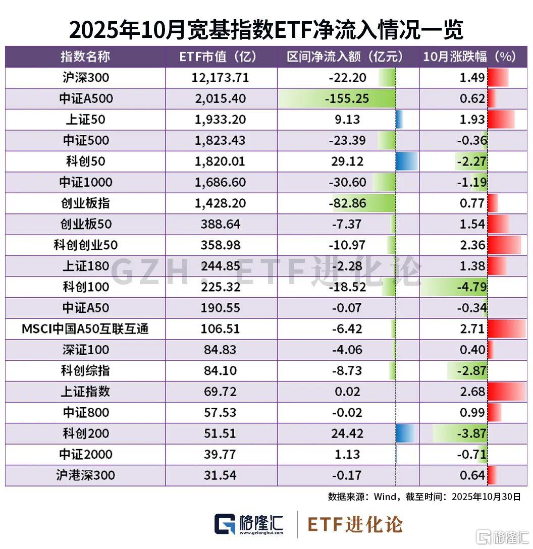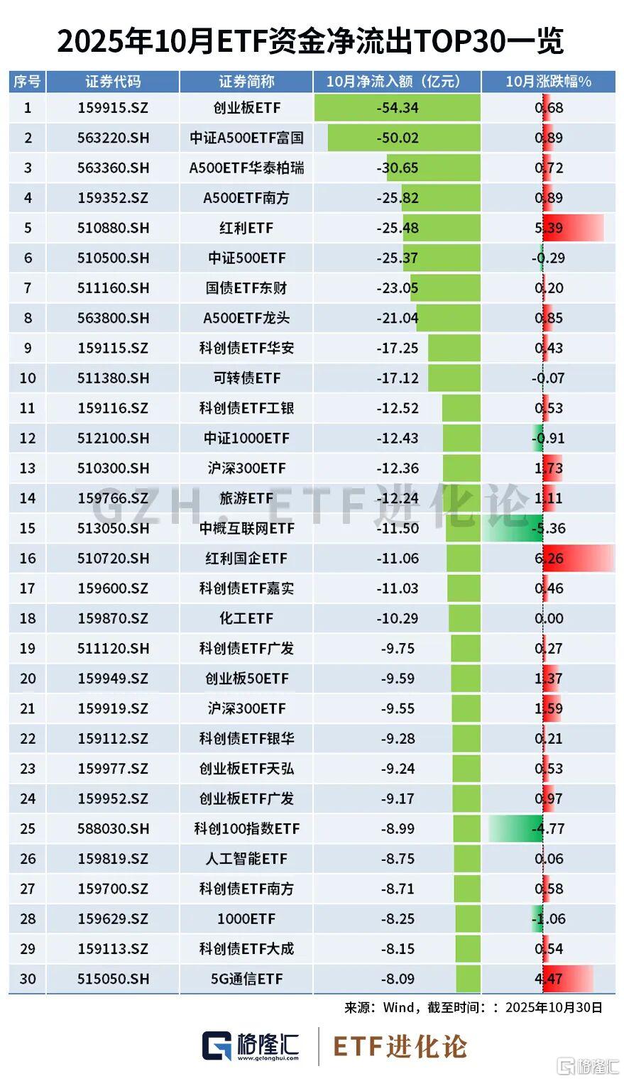 创业板ETF、中证A500ETF富国、A500ETF华泰柏瑞在10月分别净流出54.34亿元、50.02亿元、30.65亿元、