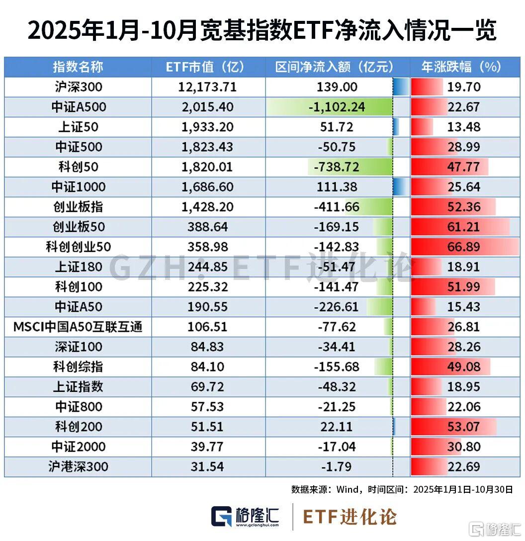1月-10月,中证A500指数狂流出1102亿元,科创50、创业板指分别净流出738亿元和411亿元,沪深300年内反而净流入139亿元。